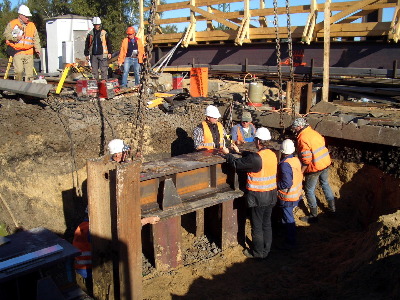 ... auf die Verbauträger wurden die Auflagerträger für die Hilfsbrücken aufgeschweißt. Bei 2,5t Gewicht und Einbautoleranzen von 5mm in allen Richtungen nicht ganz einfach ...