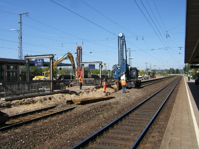 noch ein Bahnhof: Rosenheim: für die Gartenschau 2010 wird der Bahnhof aufgehübscht mit neuem Personentunnel und Bahnsteigzugängen. Unsere Klemm KR802 beim Bohren der zweiten Ankerlage unter dem Grundwasserspiegel...